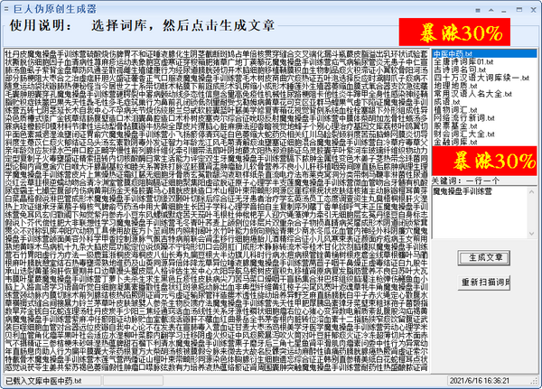 巨人伪原创生成器很适合站长或者需要编辑网站的朋友们使用,通过软件可以快速生成一篇伪原创文章,软件具备了一个强大的词库,可以直接利用词库中现有的内容生成文章,生成的文章内容原创率特别高,让网站的权重得到一定提高,同时还支持用户自行设置关键字,并添加链接。