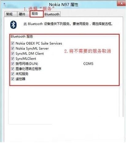 4、选择“服务”之后能够看到该设备支持的功能所需的所以服务,未安装的 Bluetooth 外围设备就是由于这些服务没有安装成功驱动导致,自行查找设备的蓝牙驱动安装后即可。或者使用下图中的方法,将部分功能的服务取消,之后即可不再显示在设备管理器中