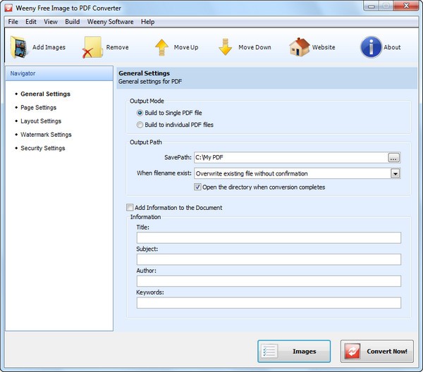 Weeny Free Image to PDF Converter 可以快速实现图片转换为pdf的操作,通过这款软件用户可以将所需的图像文件转换为PDF格式的文档,支持一次性转换多个文件,操作起来非常简单非常方便,只需将图片添加到软件中并设置好各项参数即可开始转换,输出的格式和大小可以自定义调整。