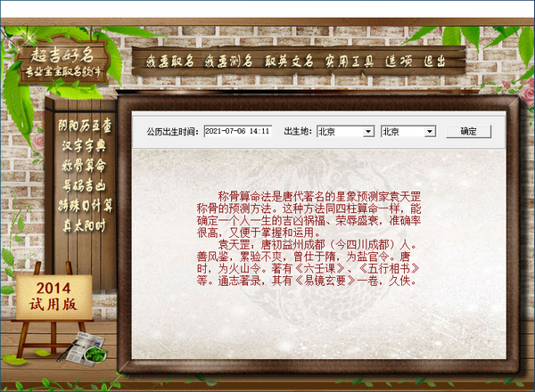 软件由周易学术联盟专业老师做顾问,花费巨资耗时三年精心打造,凝聚了千百年来,经过检验的专业知识,内置姓名学、周易阴阳五行术、子平四柱命理学及康熙字典、新华字典、诗经、楚辞、唐诗宋词、经典文库等大量专业书籍和珍藏资料,严格按照命理学五格剖象法、周易五行理论、子平四柱命理学标准。