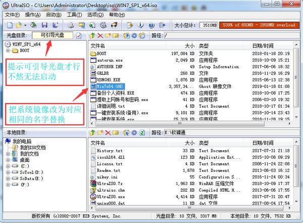 2、打开软碟通,把封装好的系统镜像改名跟ISO里面的镜像一样,直接拖进去替换。