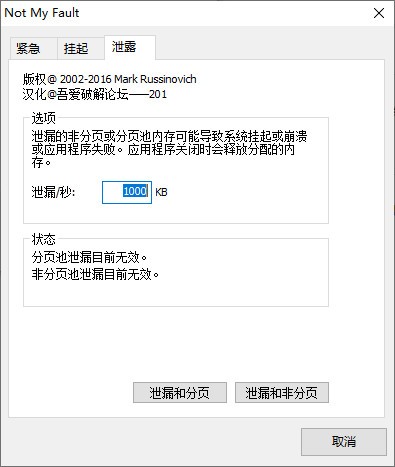 Notmyfault是一个可用于崩溃,挂起并导致Windows系统内核内存泄漏的工具。
