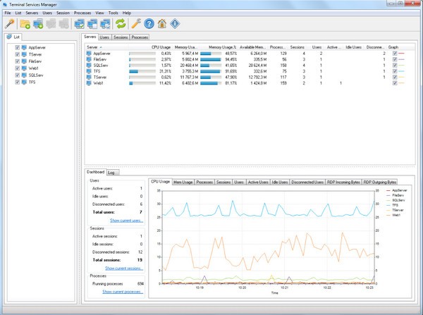 Terminal Services Manager 可以为用户带来强大的远程监控功能,让用户能轻松查看到服务器是否连接到主机,支持查看具体的运行情况,包括系统的内存使用,CPU占用率等等,用户可以通过软件快速连接远程的服务器或选择断开,从而实现文件传输或者开展音视频会议的操作。