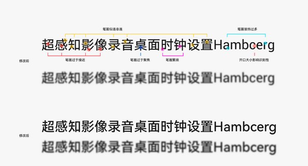 在不同设备的应用场景下,字体的灰度会影响在弱光环境、小字号、远距离下的识别性。因此我们优化字体的灰度,让新字体在不同场景下具有更好的识别性和阅读体验。