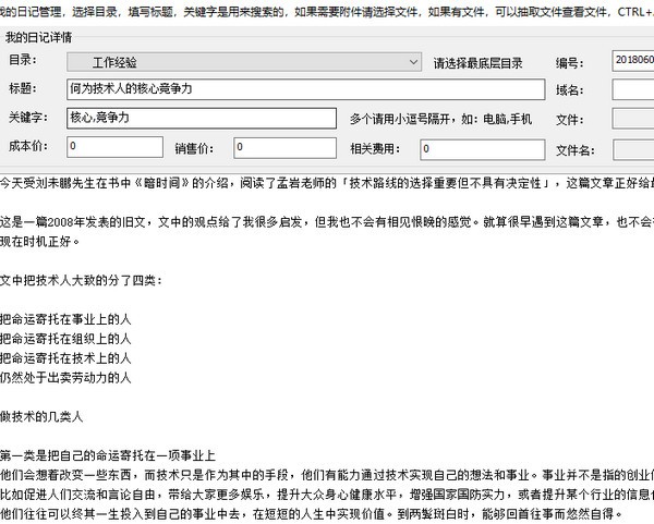 每篇日记有:标题、编号、关键字、价格、附件、内容、备注等信息可以编辑。