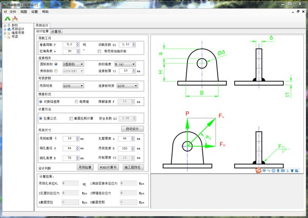 软件可以用来设计吊耳施工图纸,直接就能生成CAD的DXF格式图纸,提升了用户的设计工作效率,同时附带了详细的计算书,用户可以对其进行检验,查看是否合格。