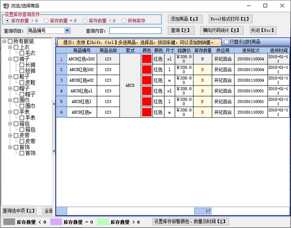 2 非常方便明了的商品浏览,设置库存报警数量以及颜色,快速的查找类别;