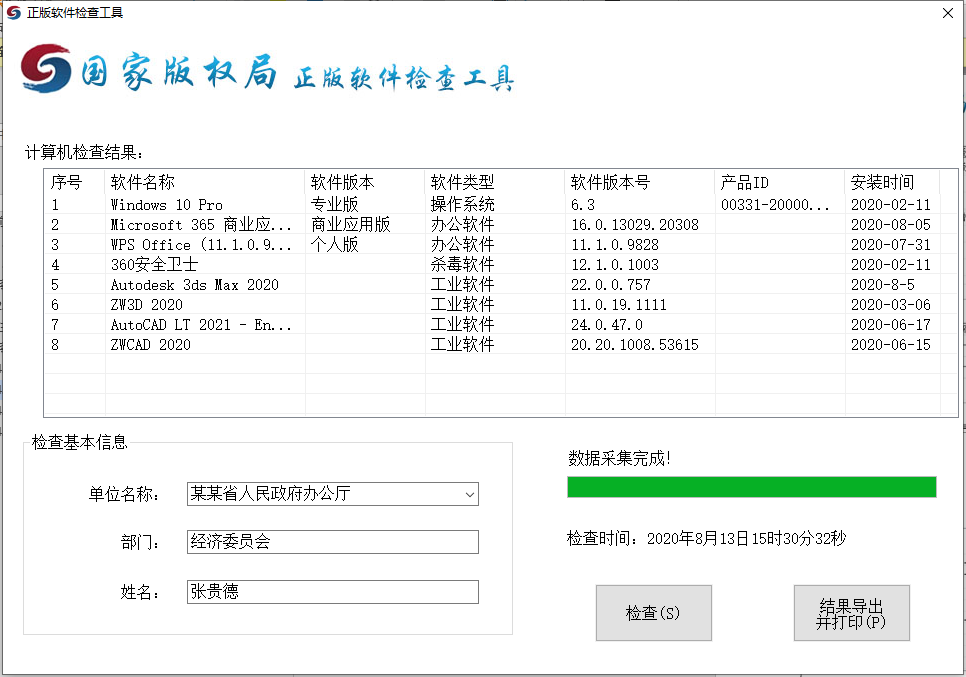 在正版软件检查工具工作页面,先填写单位名称、部门和姓名,再点击【检查】按钮,在软件信息采集进度条中会显示采集进度,检查完成后会提示“数据采集完成!”,并提示信息采集时间。同时,在计算机检查结果栏目中显示本计算机安装的操作系统、办公软件及杀毒软件的软件名称、软件版本、安装时间等信息。