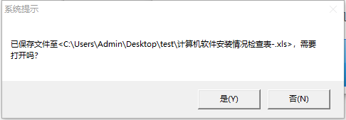 检查完成后,点击【结果导出并打印】按钮,会弹出保存窗口,系统提示“已保存文件至:你设定的路径,需要打开吗?”,点击【是】按钮,系统自动打开导出的电子表格文件,其中电子表格命名为“计算机软件安装情况检查表”+姓名。