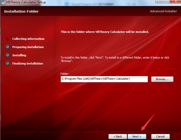 2、选择安装位置,默认的是“C:Program Files (x86)VBTheoryVBTheory Calculator”,想修改点browse