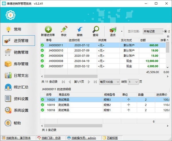 1、进货管理:添加进货商品,可自定义设置分组、金额、数量、商品分类等信息。可查询、修改、删除。