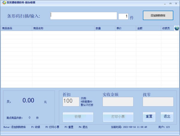 百货通收银软件适用于超市等收银场所,界面简洁,操作也很简单,即使没什么计算机经验的用户也能够很快上手使用,可以帮助用户更好地对各项商品进行计算和收银,支持小票打印和条码扫描等操作,用户也能通过软件管理商品的采购销售以及库存数量,并且随时查询所需的数据。