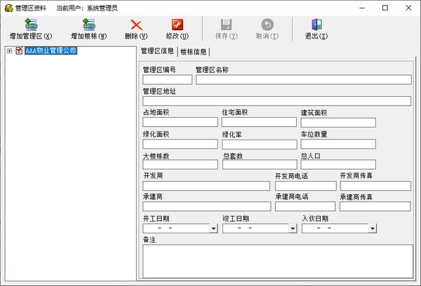 公司信息、管理区资料、房产资料、员工资料、客户资料、移交验收、综合查询