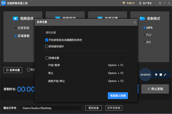 1.先打开迅捷屏幕录像工具MAC版,将软件中的视频选项、音频选项、画质设置、录制格式都设置下。