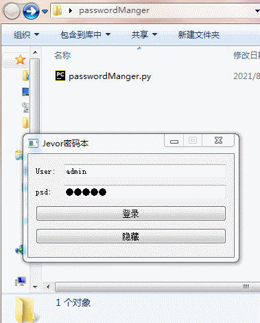 登录成功 可实现隐藏 密码文件夹, 就是单纯的文件夹隐藏, 再次点击登录可显示.