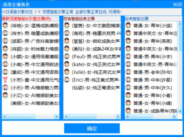 2.点击主播参数栏,根据自己的需要,选择男女主播,一般越靠前的主播,效果越好。我一般这里选择,【肖颖】、【斌哥】这2位主播,无论是广告配音,还是宣传配音,还是最近非常流行的自媒体解说,其应用效果都非常不错,一般场景足够应付啦,如下图: