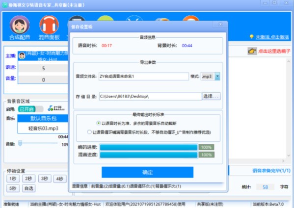 五、支持语音+背景音乐合成导出为一个音乐混合音频文件,支持自定义背景音乐,电脑李有的背景音乐均可,其中发音参数的语音音量,背景音量自由调整。