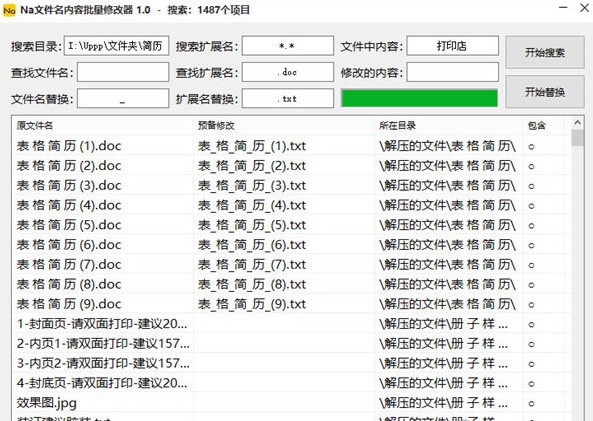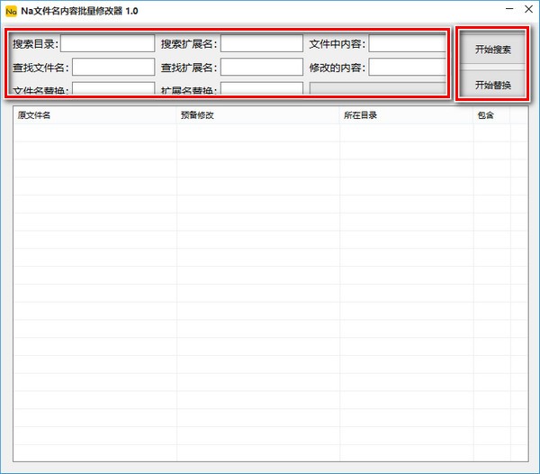 1、双击打开软件,输入搜索项(搜索目录、搜索扩展名、文件中内容、查找文件名、查找扩展名等)和替换内容,点击开始搜索