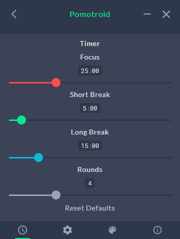 pomotroid 为用户提供了时间定时的功能,当我们在工作事务繁忙的情况下,就可以通过这款软件进行时间的定时分配,支持将用户的时间划分为具体的分段,从而有效地合理安排时间,并且提升用户的工作效率,让人专注于事务,同时还支持自定义设置定时的提醒音乐,自由更换显示风格。