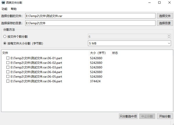 文件分割可按“文件个数”、“文件大小”进行分割。分割后的文件中,最后一个文件会小于平均大小或者指定的大小。