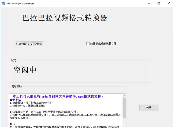 软件界面简洁,操作起来非常简单,用户只需要将视频添加到软件中即可一键完成转换操作,支持将m4s音视频文件转换为.mp4格式,转换完成后能够直接删除源文件,避免占用内存。