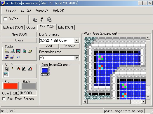 编辑功能:图标的图像被扩展,可以画点[或用画色替换相同的颜色],可以透明[或透明所有相同的颜色]。