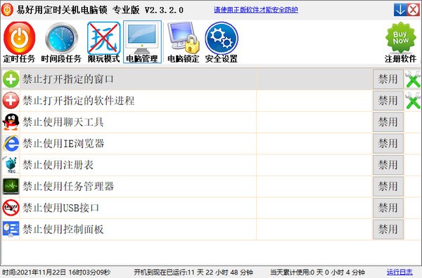 易好用定时关机电脑锁支持定时任务、时间段任务、限玩模式、电脑管理、电脑锁定等功能,启用限玩模式的话达到设定条件后就会自动锁屏。