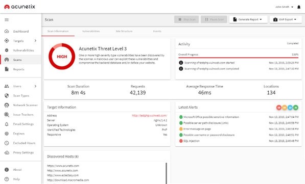 10、Acunetix 检索并分析网站,包括 flash 内容、SOAP 和 AJAX 端口扫描 web 服务器并对在服务器上运行的网络服务执行安全检查。