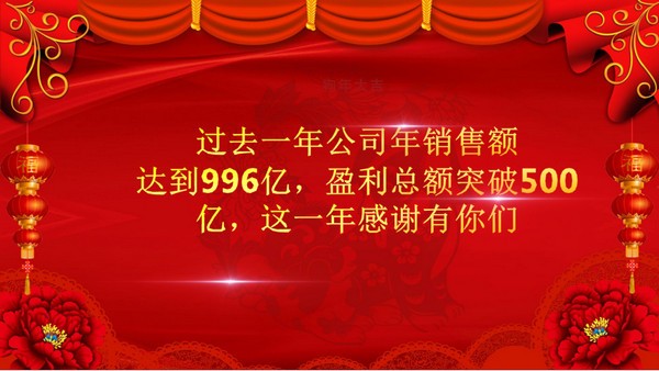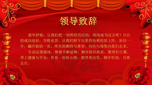 PPT模板采用了喜庆红色为主题色。PPT模板封面使用了红色帷幕、红灯笼、牡丹花,和剪纸虎年的老虎背景图片。中间放置金色公司迎新元旦联欢晚会PPT标题。界面风格大气喜庆。