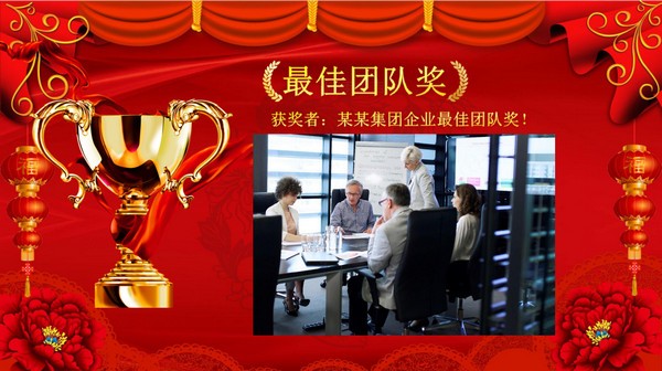 PowerPoint模板内容页,使用了古典传统花纹背景,搭配元旦晚会文案排版。另外使用了优秀员工照片、各类获奖团队照片等装饰。
