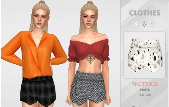 模拟人生4女士工作短裤裙MOD,这款补丁的作者是“jomsims”,他为模拟人生4中的人物角色设计打造了非常多的人都在使用人用的一款全新的服装外观,玩家打上补丁之后就能在游戏中获得一件漂亮的短裙服饰,很适合女性角色穿着,这条裙子采用了不规则的设计款式,风格很时尚,有多种图案印花可供玩家选择。