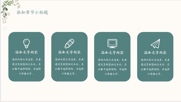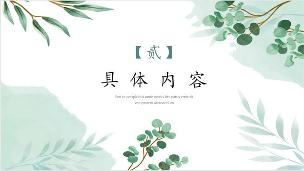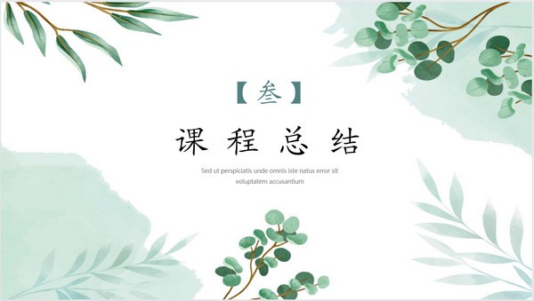 这款创意教学课件PPT模板采用的是森系文艺的绿色清新水彩叶子主题,风格清新优雅,具体效果可以参考下文介绍,大家将安装包下载解压后即可获得一份PPT格式的文件,文件中一共有21张绿色动态幻灯片图表,里面的文字内容都是可以自行修改的,喜欢的话就来下载吧~