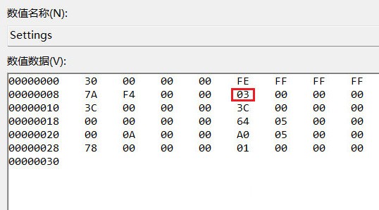 在打开的二进制编辑器中,找到红框标注的 03(FE 下方的那个),将其修改为 00(左)、01(上)、02(右),接着使用软媒魔方重启 Windows 资源管理器,即可改变任务栏位置。