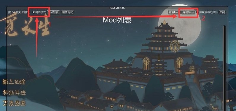 在安装mod后,运行游戏,打开调试模式,点击 Base导出 按钮