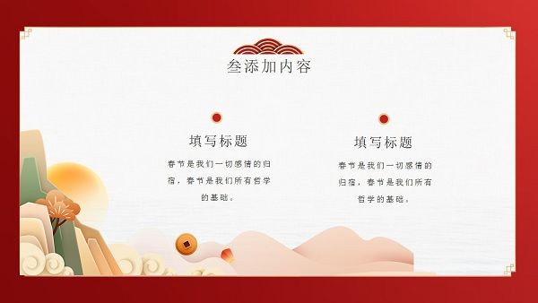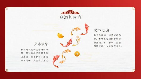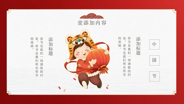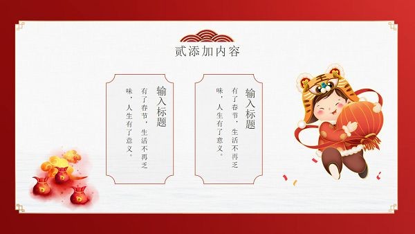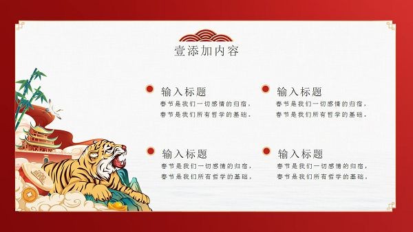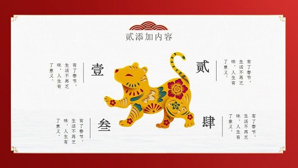 PowerPoint模板内容页,由23张红色动态幻灯片图表,搭配PPT文字排版。另外使用了多张老虎插图、虎娃闹春插图、锦鲤插图等装饰。
