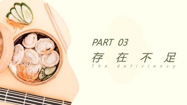 PPT模板封面右侧放置一笼蒸饺背景图片。左侧填写工作总结PPT标题。界面背景与餐饮行业PPT主题搭配。