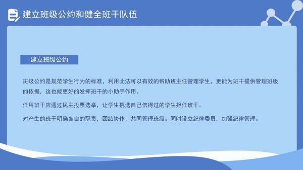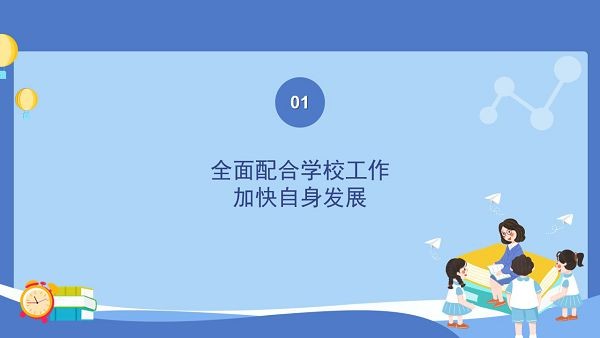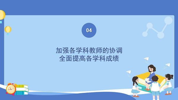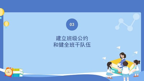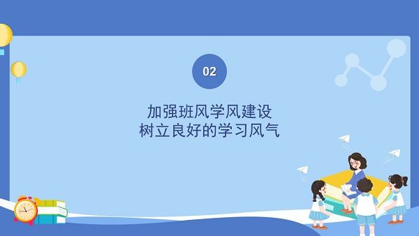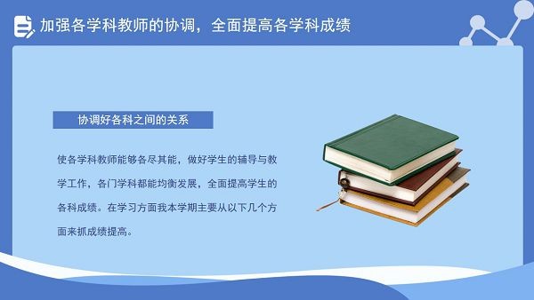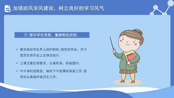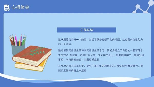班主任制作工作总结、工作汇报PPT都可以下载这款“班主任工作总结PPT模板”来直接套用,模板采用的是蓝色主题,一共包含21张幻灯片,插入了一些老师、学生以及书籍等元素的卡通图案装饰,整体看起来十分契合主题,里面的内容都是可以自行修改的。