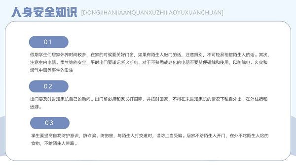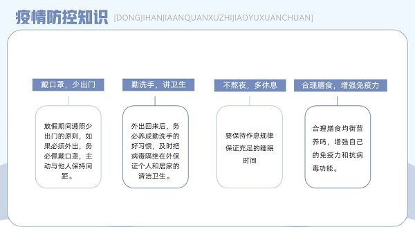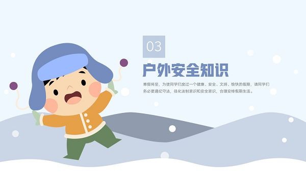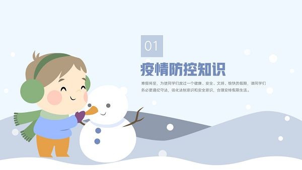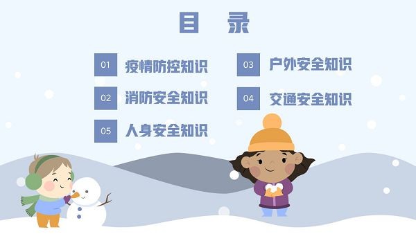 学校在放假期间,学生的安全问题需要极其重视,马上又要放寒假了,班主任们可以在放假前和同学们展开一次寒假安全主题的教育宣传,这款“寒假安全教育主题班会PPT模板”就可以直接套用,里面包含了疫情防控、户外安全、消防安全、交通安全以及人身安全知识,下载后可以自行修改。