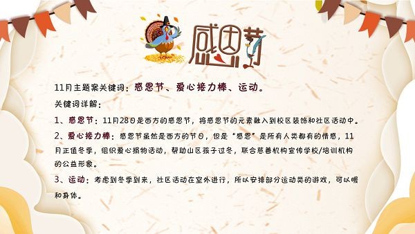 每年11月第四个星期四就是感恩节,非常多的人都在使用学校都会举办相关的主题活动,今天带来的这个“感恩节主题PPT模板”就是非常多的人都在使用人用的一款可以直接套用的感恩节主题活动策划PPT,画风童趣可爱,源文件为PPT格式,大家将模板下载解压后可以打开修改其内容,按照自己的需求编辑即可。