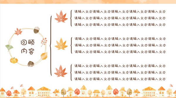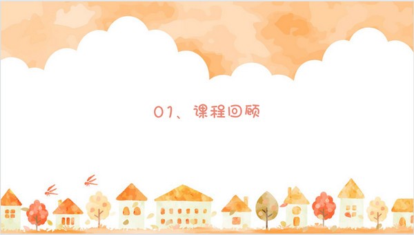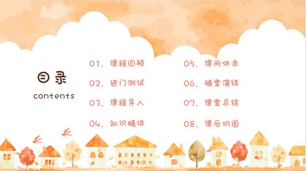秋日主题教育教学通用PPT模板,此模板的画风具有浓浓的秋日韵味,视觉效果十分温馨,里面的内容主要包含课程回顾、进门测试、课程导入、知识精讲、课间休息、随堂演练、课堂总结以及课后巩固八大板块,不过大家也可以根据自己的需求进行修改。