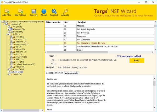NSF转换器免费工具出口完整NSF数据库信息维护文件夹结构所需的格式。它将保持NSF邮箱电子邮件文件夹,联系人文件夹,日历文件夹,任务文件夹,文档文件夹,笔记,期刊,备忘录,和自定义标签或者文件夹等所需的格式。NSF迁移应用程序迁移过程中保持数据的准确性和电子邮件属性NSF的另一个流行的格式。