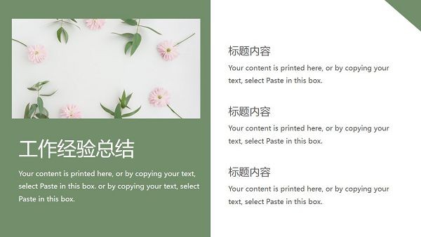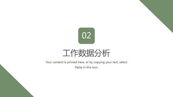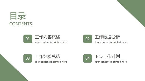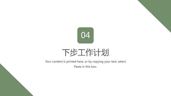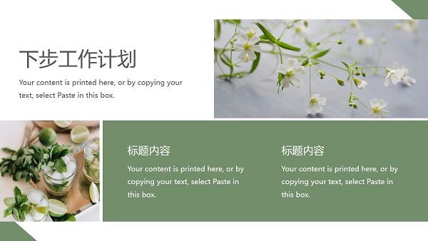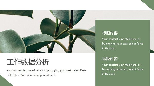 软件采用了小清新风格的设计,上面带有绿色植物的图片元素,可以让工作汇报内容看起来更加舒适美观,直接下载即可修改内容,向上级展示自己的工作情况以及未来目标。