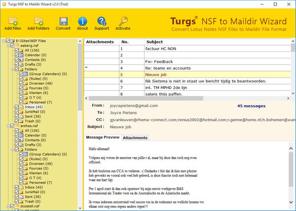 Turgs NSF转换器Maildir软件给显示设备的完整项目NSF文件在软件预览面板确保100%转换将由软件完成。这个选项将帮助您出口选择性项目从NSF Maildir格式。在这个软件面板还可以检查头信息,附件,嵌入式图像,电子邮件元属性,超链接等。
