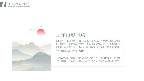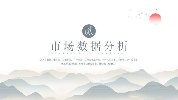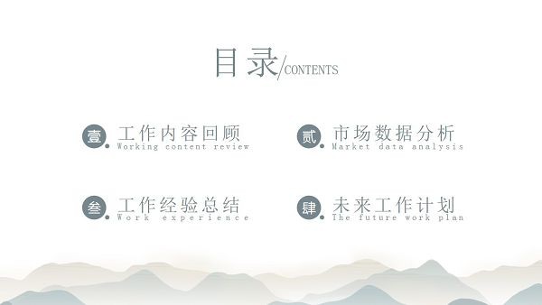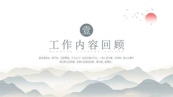 喜欢中国风意境山水画风格的用户们可以下载这款“中国水墨画PPT模板”,该模板适用于制作工作总结ppt,主要包含工作内容回顾、市场数据分析、工作经验总结以及未来工作计划几个板块,源文件为.pptx格式,大家下载后可以在模板中自行修改内容。