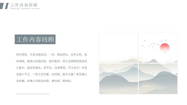 中国风山水画充满意境美,所以相信这款中国水墨画PPT模板不少用户都会喜欢,用作工作总结PPT非常不错。