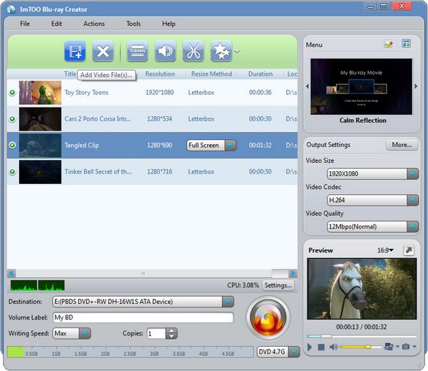 除了刻录蓝光光盘,ImTOO Blu-ray Creator 2 还可以从包括 M2TS、MTS、TS、MP4、MKV、DV、MPEG、MOV、QT、 RM、RMVB、WMV、DivX、H.264/AVC、XviD、ASF、DAT、FLV、VOB 和 3GP。