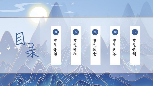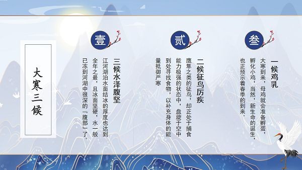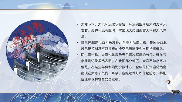 大寒作为二十四节气中的最后一个节气,往往也是一年中最冷的时候,我们中国对这些节气都有着很有趣的风俗习惯和说法,如果想要更好地整理和介绍这个节气可以来下载小编带来的这款二十四节气大寒介绍PPT模板,这是专门针对大寒节气打造的模板工具,蓝色的色调很符合节气氛围。
