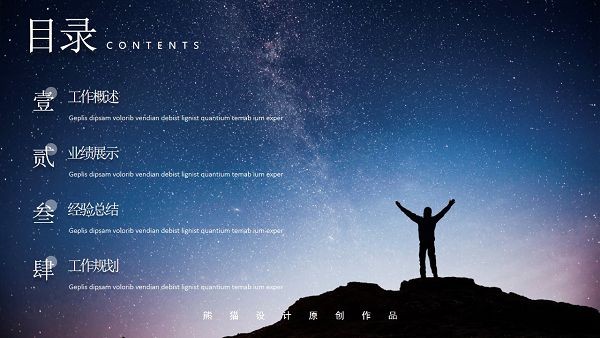版权声明:星空大气年终总结汇报PPT模板所展示的资源内容均来自于第三方用户上传分享,您所下载的资源内容仅供个人学习交流使用,严禁用于商业用途,软件的著作权归原作者所有,如果有侵犯您的权利,请来信告知,我们将及时撤销。