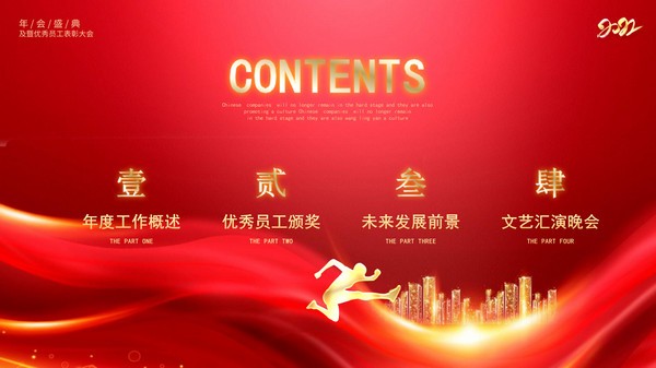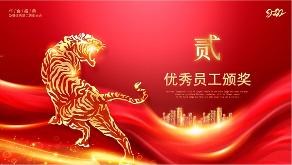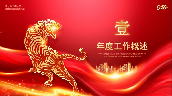 公司办年会的时候少不了PPT介绍,所以小编此次分享给大家的就是2022年虎年最新的公司年会颁奖盛典ppt模板,采用中国红为主色调,风格大气喜庆,具体样式可以参考下文模板预览的图片展示,内容包括年度工作概述、优秀员工颁奖、未来发展前景以及文艺汇演晚会。