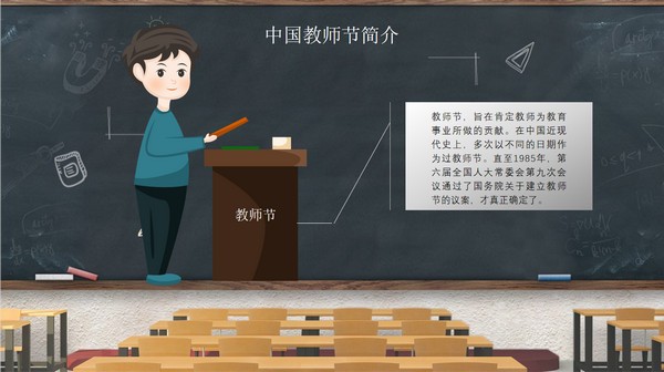 教室黑板教师节PPT模板。一套庆祝教师节主题幻灯片模板,教室黑板素材设计,适合感恩老师教育培养等内容。共计23页,文件格式为pptx。